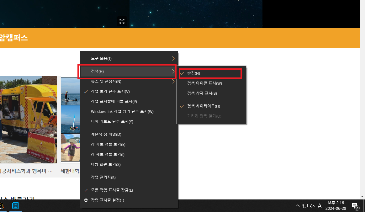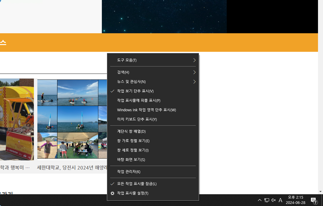 2. 작업표시줄을 우클릭하여 메뉴를 띄웁니다.