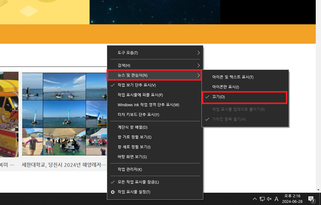4. 뉴스 및 관심사 메뉴를 끄기로 변경합니다.